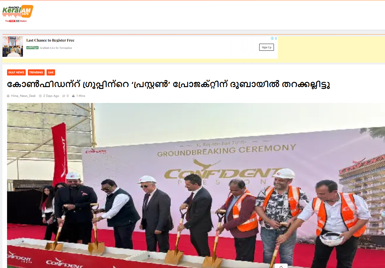 Dubai, UAE: South India’s leading real estate developer, Confident Group, has officially laid the foundation stone for its latest residential development, Confident Preston, in Dubai’s thriving Liwan district. The project marks another milestone in the Group’s growing presence in the UAE real estate sector.