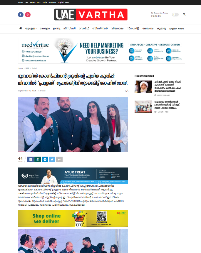 ദുബായ്:ദുബായിലെ ലിവാൻ ജില്ലയിൽ കോൺഫിഡന്റ് ഗ്രൂപ്പ് അവരുടെ പുതുമയേറിയ പ്രോജക്ടായ ‘കോൺഫിഡന്റ് പ്രസ്റ്റൺ’യുടെ നിർമാണം ഔദ്യോഗികമായി ആരംഭിച്ചു. ദക്ഷിണേന്ത്യയിൽ നിന്ന് ആരംഭിച്ച് ‘സീറോ-ഡെബ്റ്റ്’ റിയൽ എസ്റ്റേറ്റ് മോഡലിലൂടെ വിശ്വാസ്യത നേടിയ കോൺഫിഡന്റ് ഗ്രൂപ്പിന്റെ യു.എ.ഇ. വിപുലീകരണത്തിന്റെ ഭാഗമായാണ് ഈ നീക്കം. ദുബായിലെ ആഡംബര റിയൽ എസ്റ്റേറ്റ് വികസനത്തിൽ പുതുവഴിത്തിരിവ് തീർക്കുന്ന ചടങ്ങിന് നിരവധി പ്രമുഖരും വ്യവസായ പ്രതിനിധികളും സാക്ഷിയായി.
